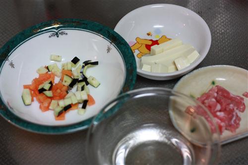 材料はニンジン・ナス・豆腐・豚肉・ダシ汁