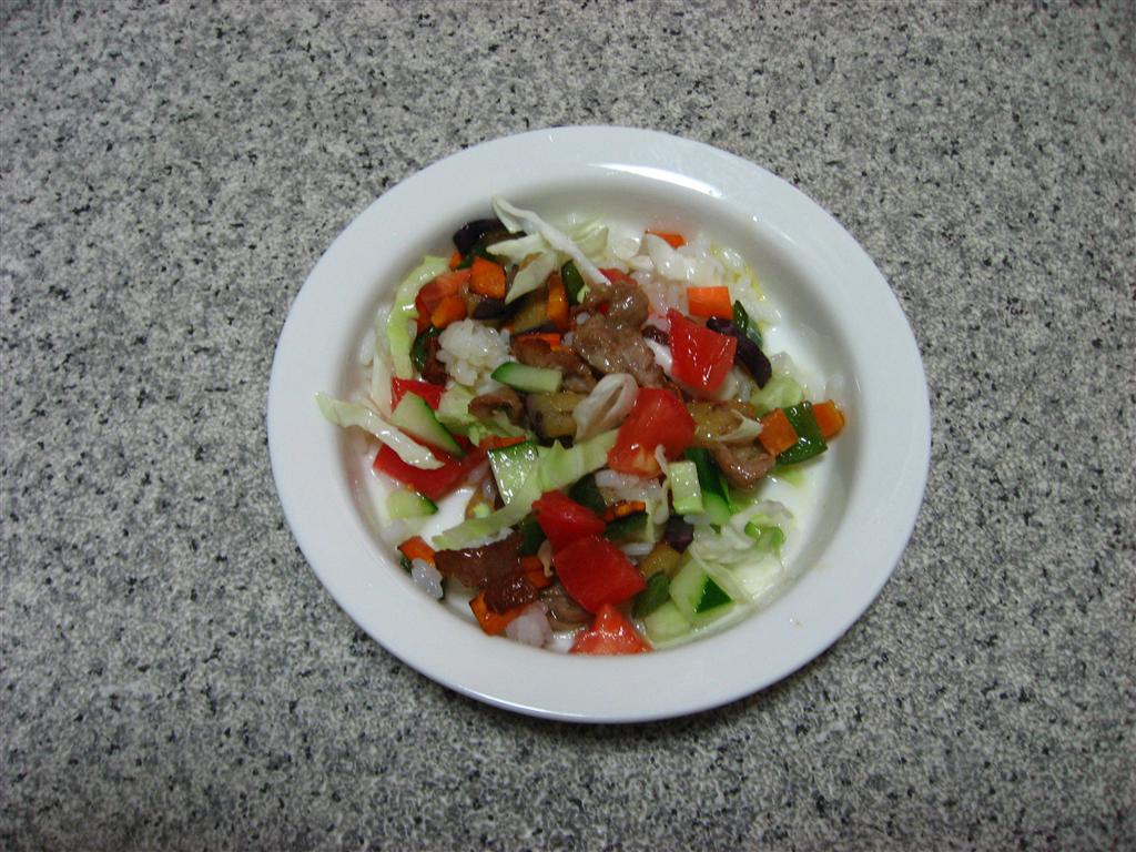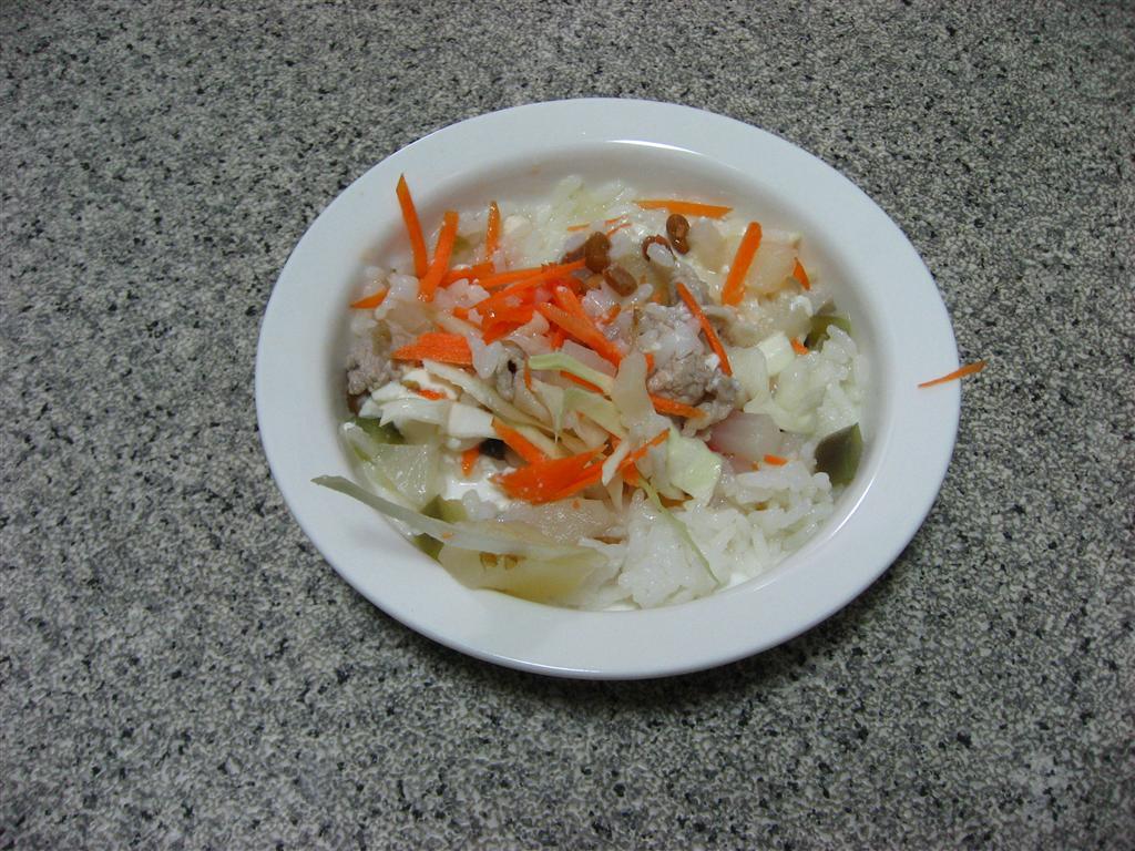 炊いたご飯に混ぜて、納豆も少し入れてます。 あと、キャベツ・人参は生のままです。