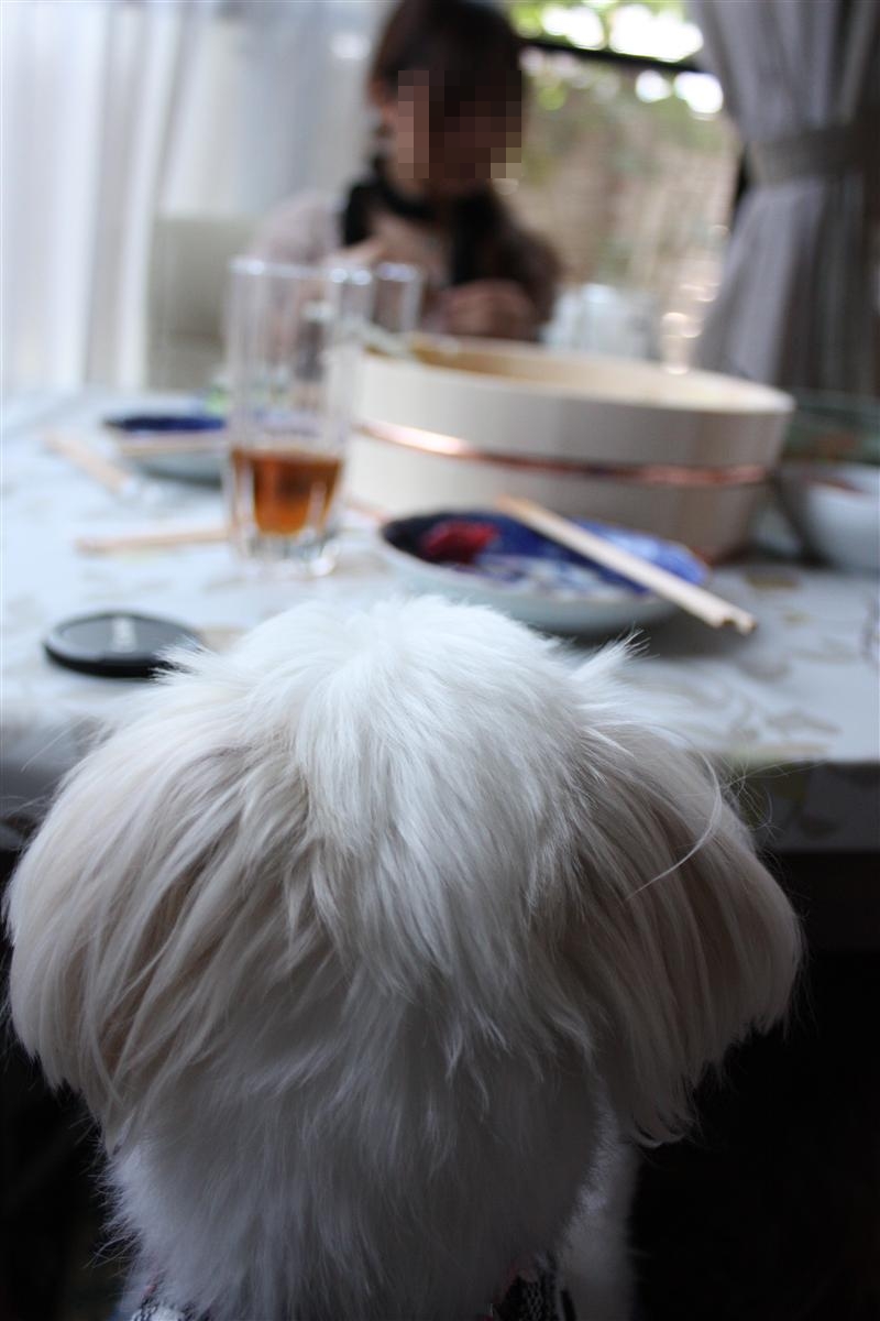 テーブルの上のご馳走を見つめるライちゃん